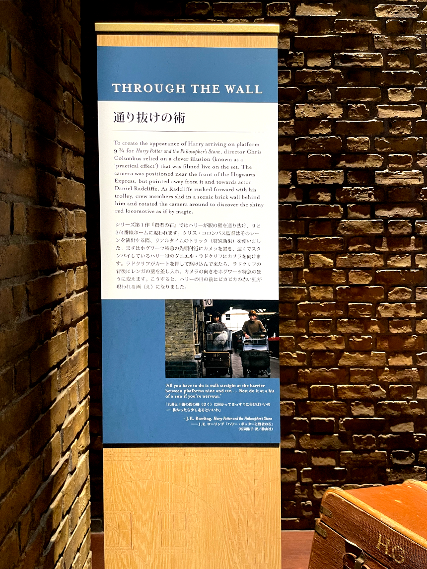 짐 카트를 밀고 벽으로 들어가는 해리포터의 상징적인 장면을 연출할 수 있도록 카트와 짐, 그리고 머플러가 준비되어 있어서, 직접 찍거나, 스태프의 도움을 받아 실감 나는 사진을 찍을 수 있어 방문객들에게 가장 인기 있는 포토존 중 하나가 되었네요.