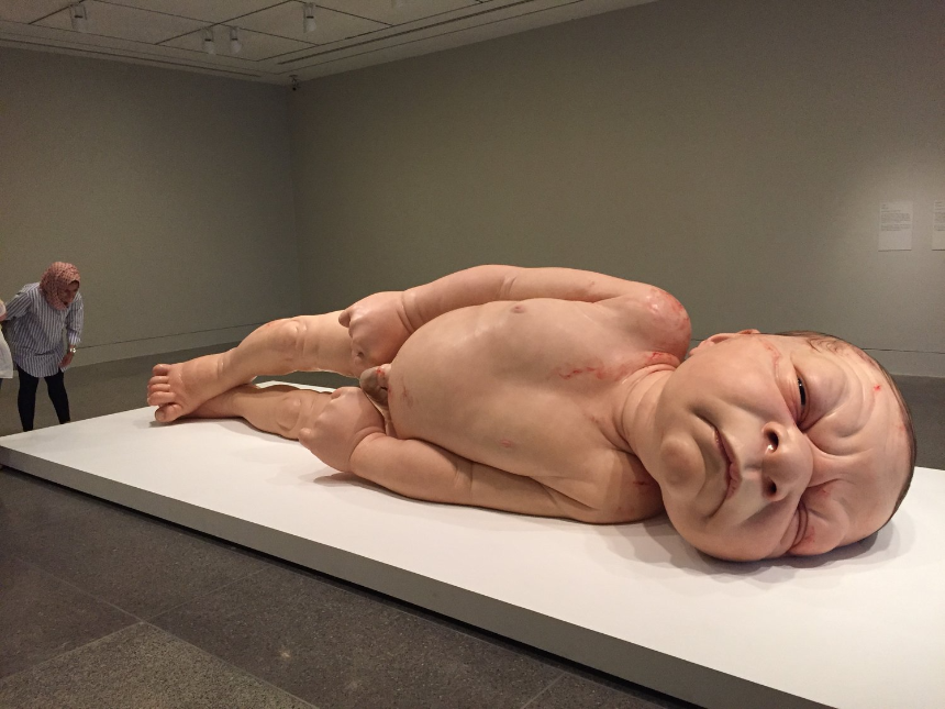 론 뮤익은 인체의 세밀한 부분까지 극사실적으로 표현하면서도 크기를 과장하거나 축소하는 방식으로 인간 존재와 삶, 죽음에 대한 근원적인 질문을 던지는 작품 세계로 유명합니다.
