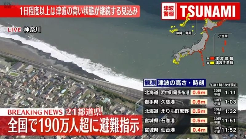 - 쓰나미 경보 등급: 일본 태평양 연안에 최대 3m 예상 경보 및 긴급 대피령, 미국 괌·하와이 등에도 쓰나미 주의보 발령