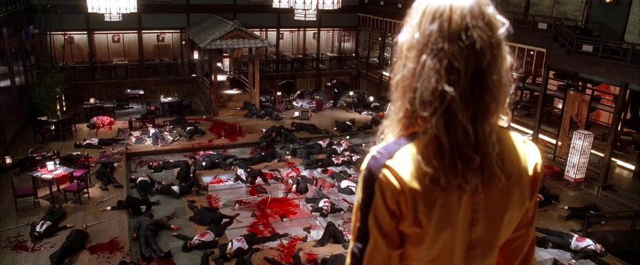 '킬 빌: Volume 1'의 가장 상징적인 장면은 단연 일본 식당 '하우스 오브 블루 리브스'에서 펼쳐지는 더 브라이드와 '크레이지 88'의 대규모 액션 시퀀스입니다.