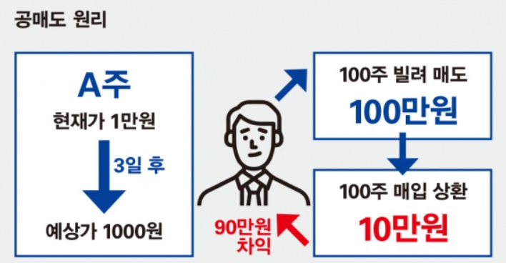 예를 들어 투자자가 A주식을 빌려 주당 15,000원에 팔고 며칠 후 그 주식은 12,000원으로 하락하였다면 12,000원에 주식을 매입하여 빌린 A주식을 되갚으면 주당 3,000원의 수익을 얻는다. 주가가 하락할 경우에는 수익을 얻지만, 예상과 달리 주가가 상승할 경우에는 큰 손실을 볼 수 있다는 점에서 공매도 투자는 매우 신중하게 접근해야 합니다. 그래서 공매도는 개미투자자가 하기 쉽지가 않죠.