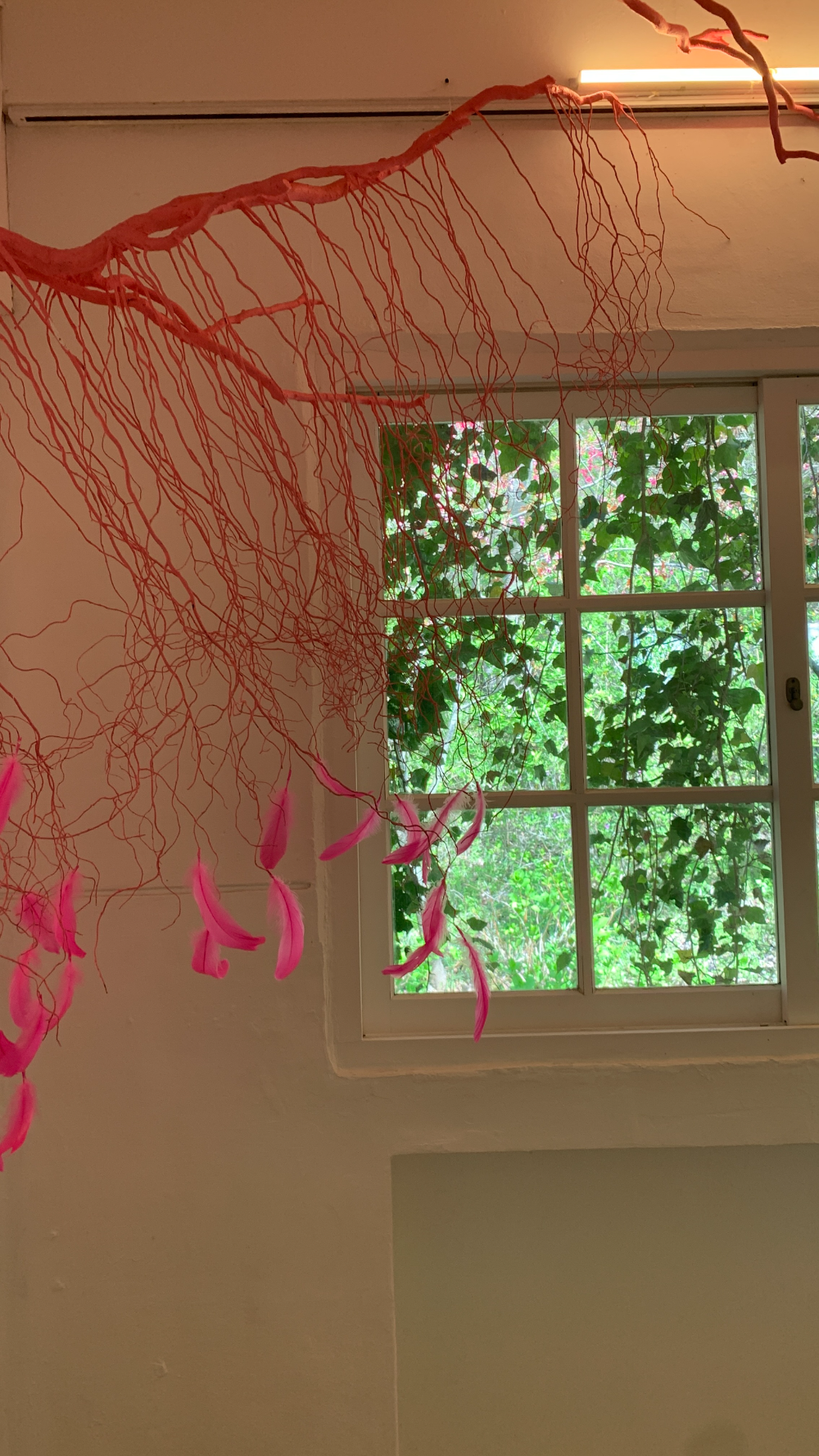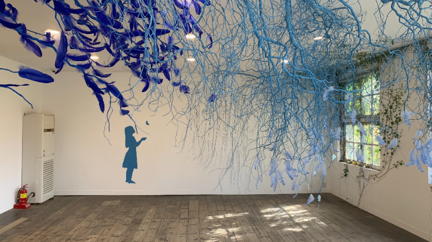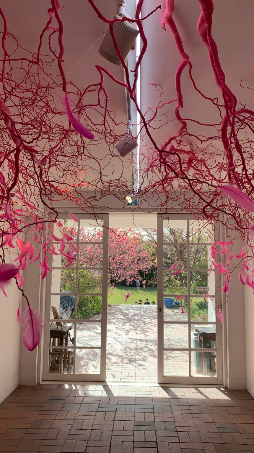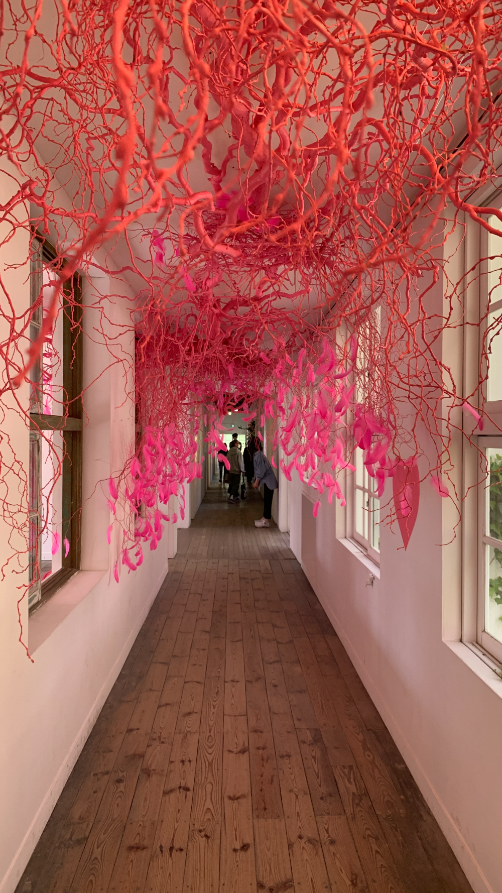 폐교 내부를 들어가면 이렇게 핑크빛 나뭇가지가 복도에서 천장에 매달려 작품으로서 승부하고 있네요.