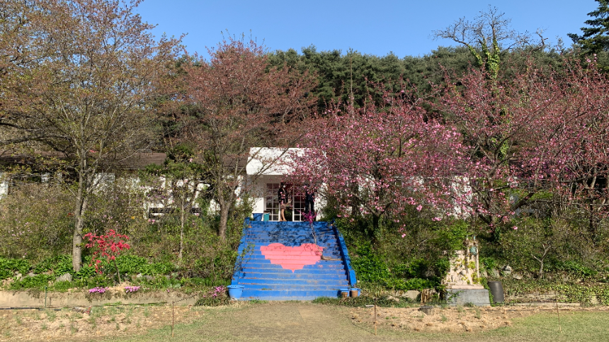 폐교의 뒷모습은 화사한 나무와 푸르른 벽면으로 인해 다들 인증 사진 찍기 바쁘네요.