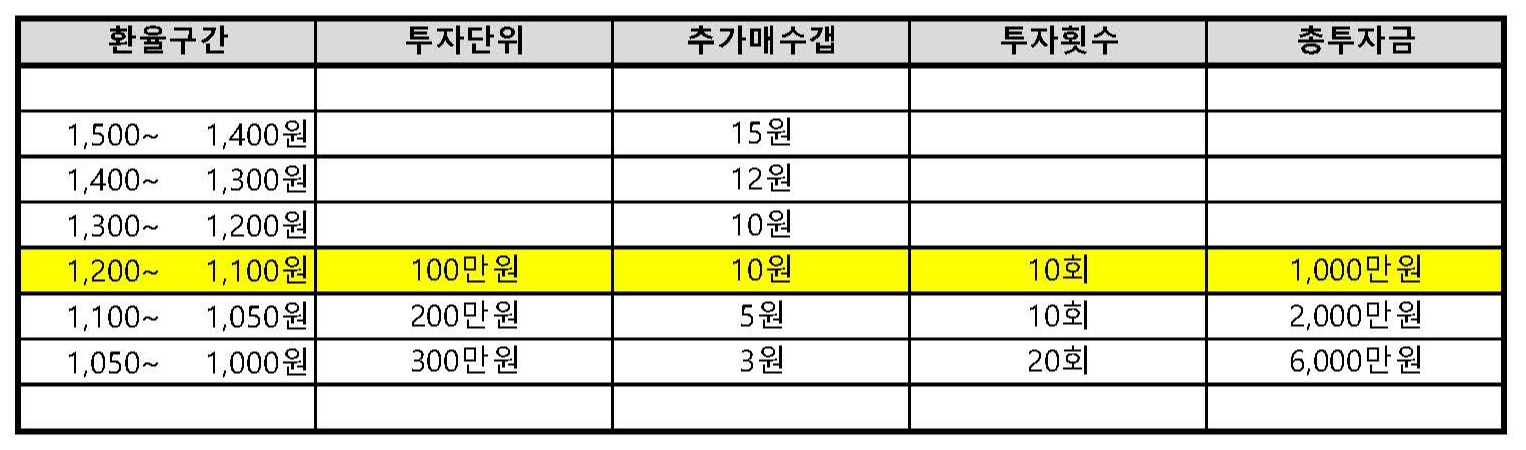 - 원/달러 환율 1,200~1,100원의 구간에서는 투자단위를 100만원 설정