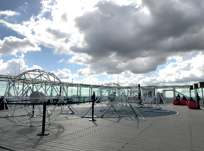 전망 테라스의 난간은 공압 기술로 높이 조절이 가능하며 수많은 안테나선이 달려 있습니다.