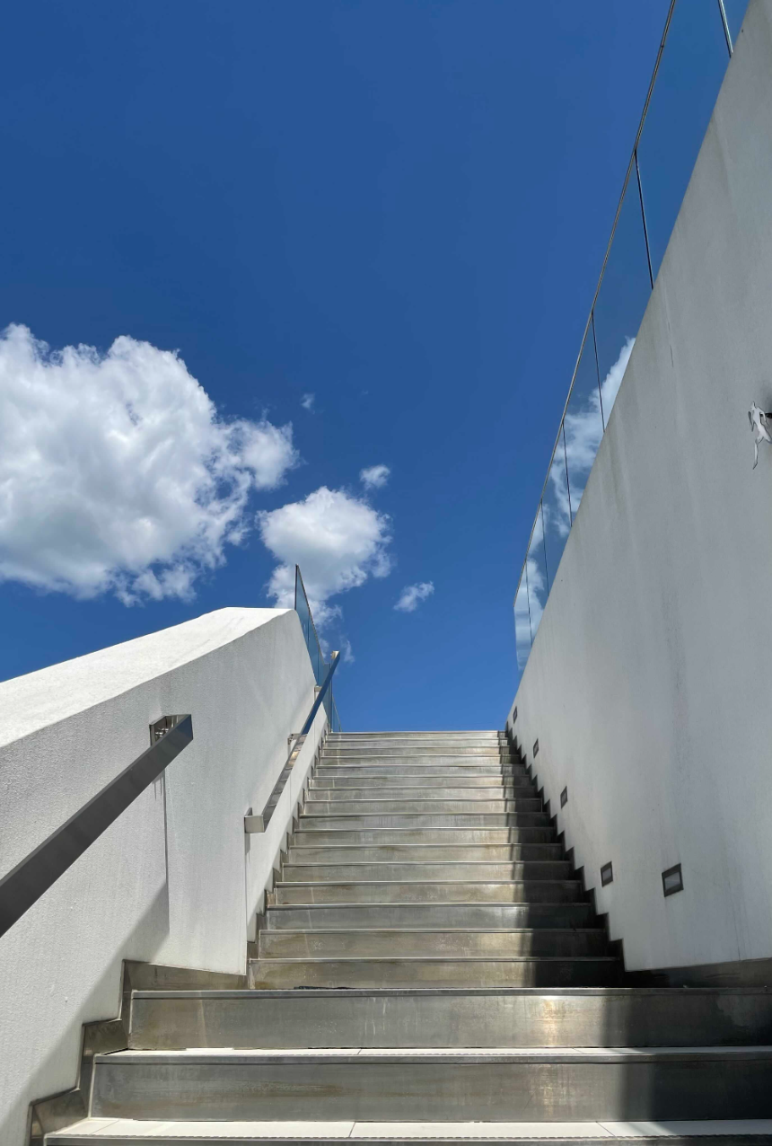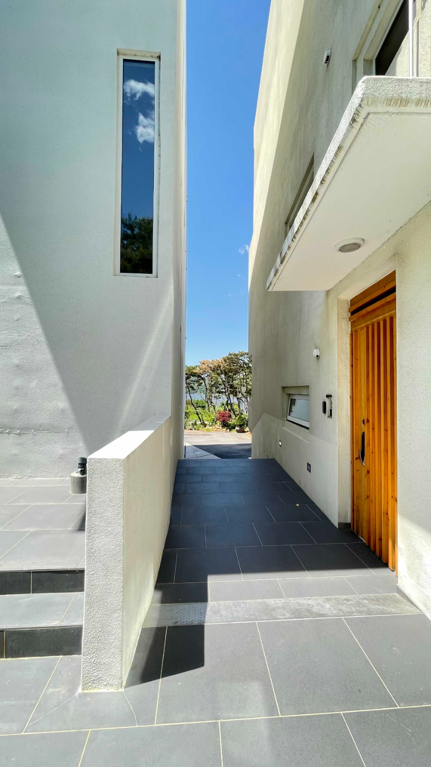 넉넉하게 마련된 주차장에 주차를 하고 올라가는 계단의 하늘이 파란색으로 선명하게 보입니다.