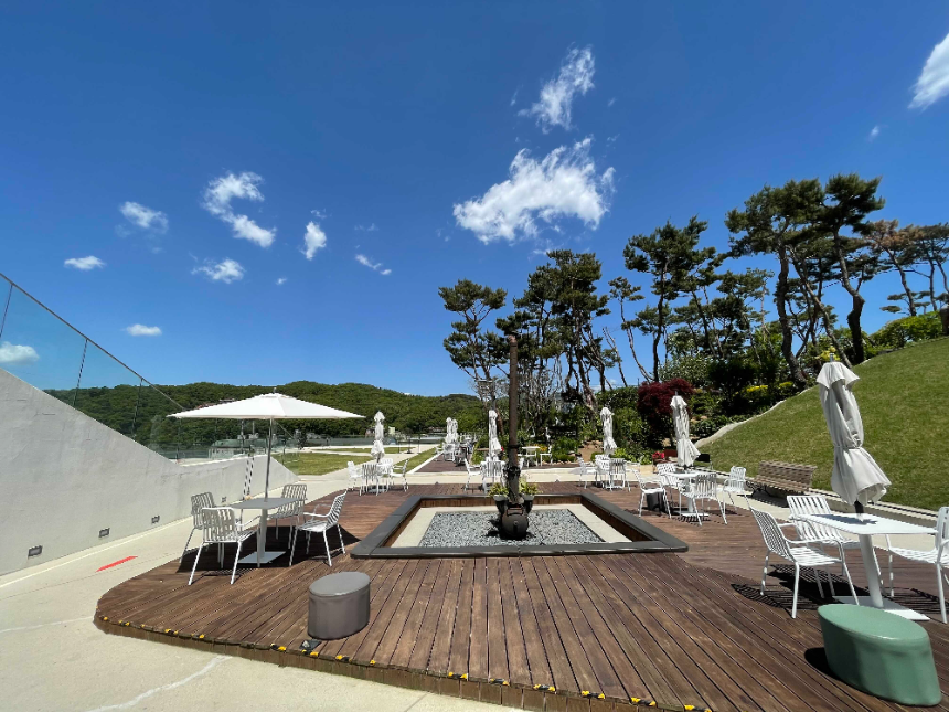 대형 계단 앞까지 오면 넓은 목재데크와 중앙 분수가 자리 잡고 있고 바로 뒤엔 카페 같은 매표소에서 인당 8천 원씩 내면 음료를 들고 카페 안팎으로 자유롭게 거닐 수 있습니다.