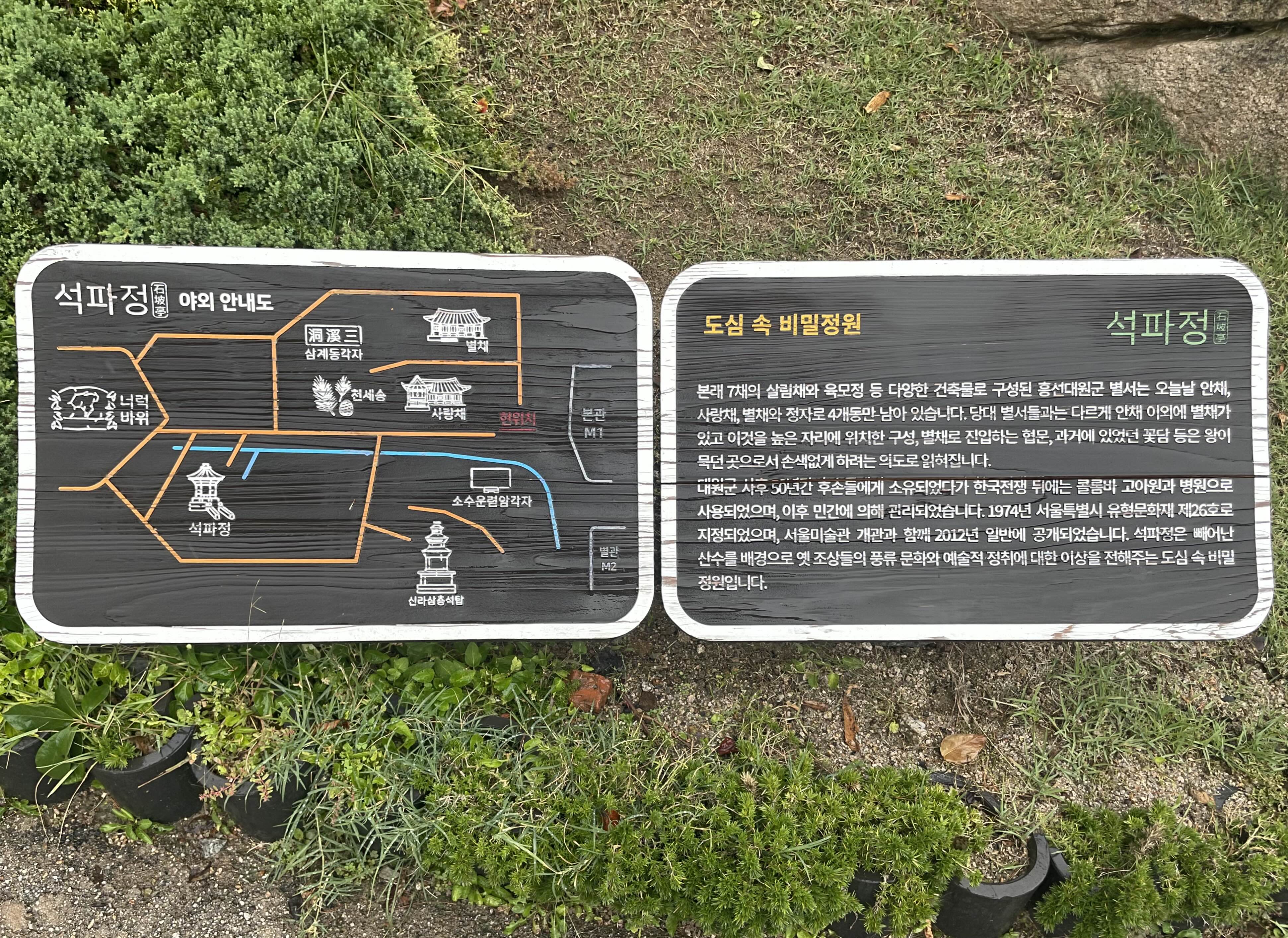 대원군 사후 50년간 후손들에게 소유되었다가 한국전쟁 뒤에는 콜롬바 고이원과 병원으로 사용되었으며, 이후 민간에 의해 관리되었습니다. 1974년 서울특별시 유형문화재 제26호로 지정되었으며, 서울미술관 개관과 함께 2012년 일반에 공개되었습니다. 석파정은 빼어난 산수를 배경으로 옛 조상들의 풍류 문화와 예술적 정취에 대한 이상을 전해주는 도심 속 비밀 정원입니다.