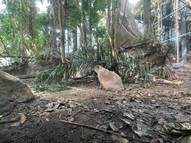 수공간을 지나 아마존 숲속인 온실 안을 가보면 '캐피바라'라 불리는 설치류가 부지런히 잎을 먹으며 서있습니다.