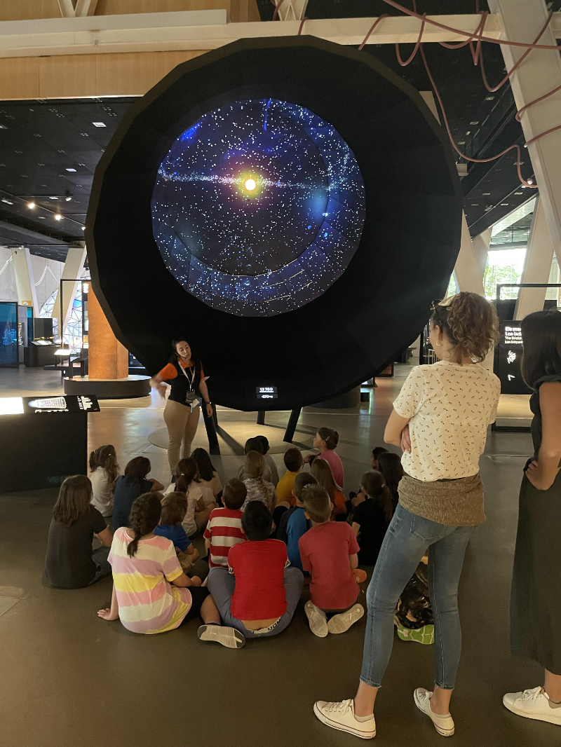 여기는 태양계를 설명하는 곳인데 많은 학생들이 열정적으로 설명을 듣고 있습니다.