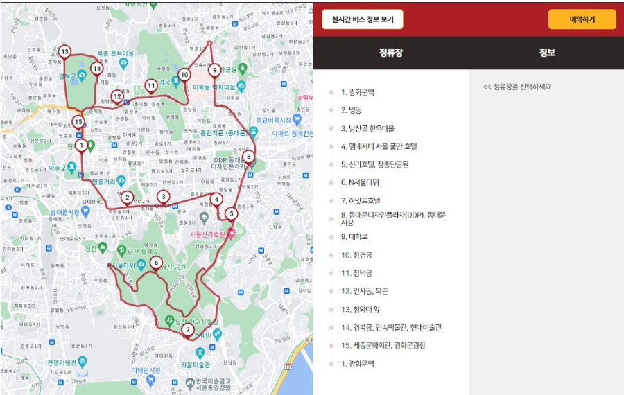 | 이용코스 | N서울타워, 명동, 남산골 한옥마을, 창덕궁, 인사동, 청와대, 경복궁등 서울 주요관광지를 순환하며 도심과 고궁, 남산이 어우러진 아름다운 서울의 모습을 볼 수 있는 코스입니다. 원하는 정류장에서 하차하여 자유롭게 관람후 다음 버스를 이용할 수 있습니다. |
