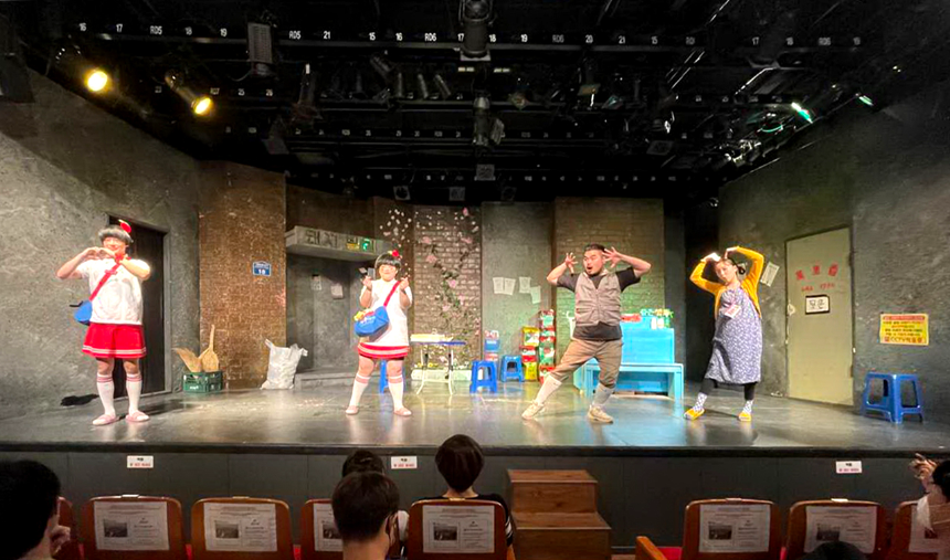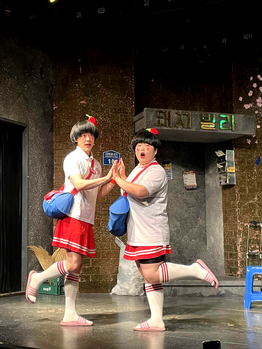 사진 뒤에 보이는 '돼지 빌라'라는 건물 앞에 유치원 커플과 분식을 파는 부부들이 부지런히 포즈를 취하는데 관객들이 연극에 적극적으로 동참할 수 있도록 노력하는 모습에 절로 신이 납니다.