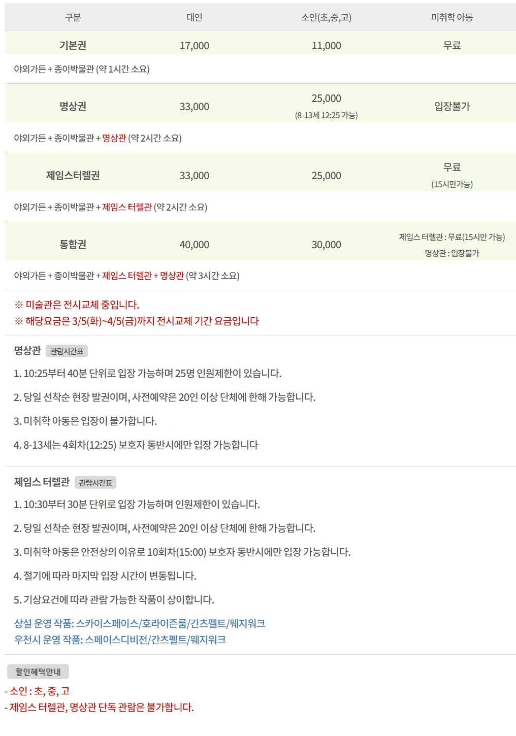 제임스터렐권 - 대인 : 33,000원,  소인(초,중,고) : 25,000원,  미취학 아동 : 무료 (15시만 가능)