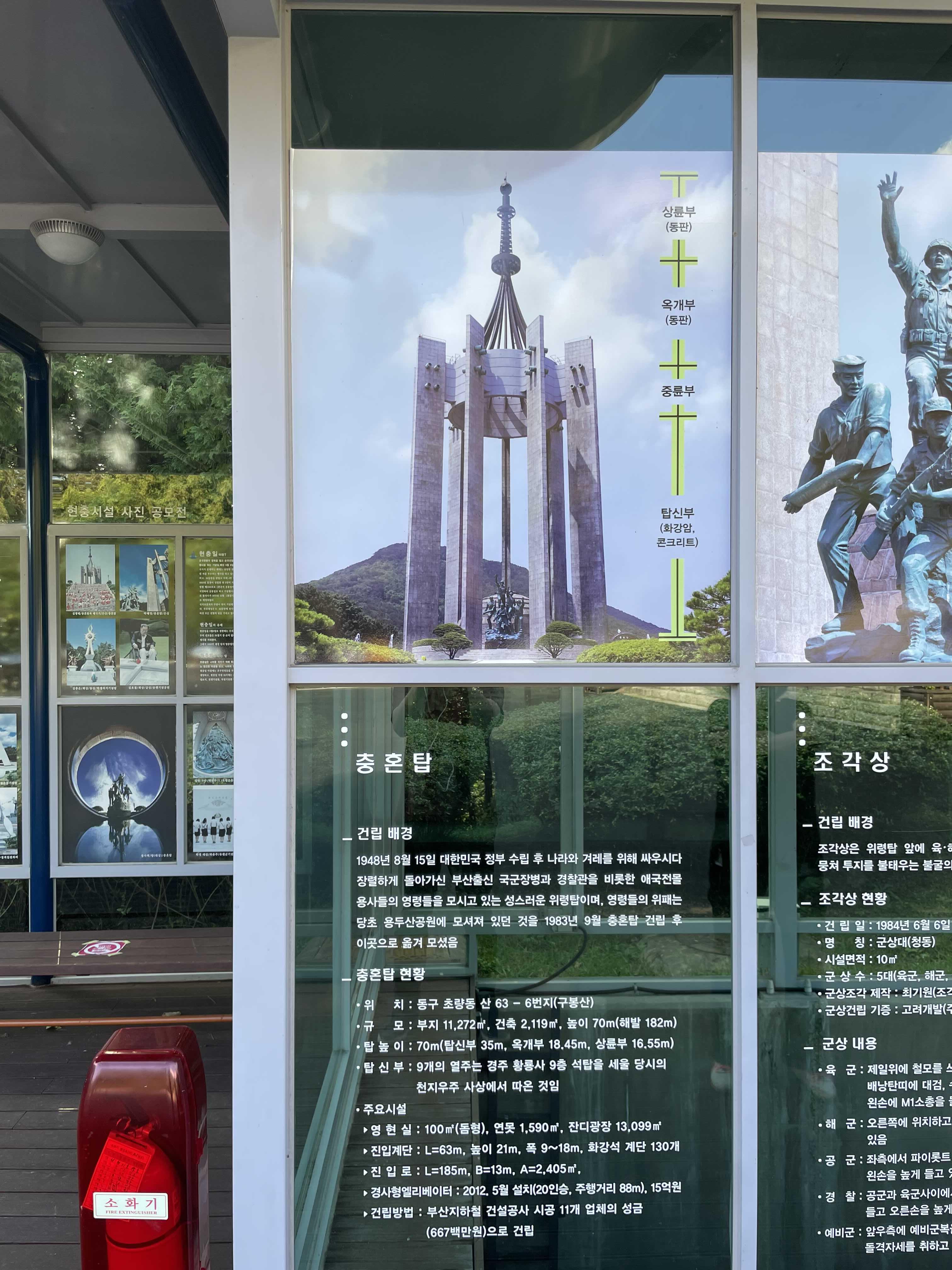 조각상 뒤에 서있는 충혼탑은 9개의 열주 아래 둥근 반원형으로 지은 영령실이 있고 전몰용사들의 위패가 모셔져 있다.