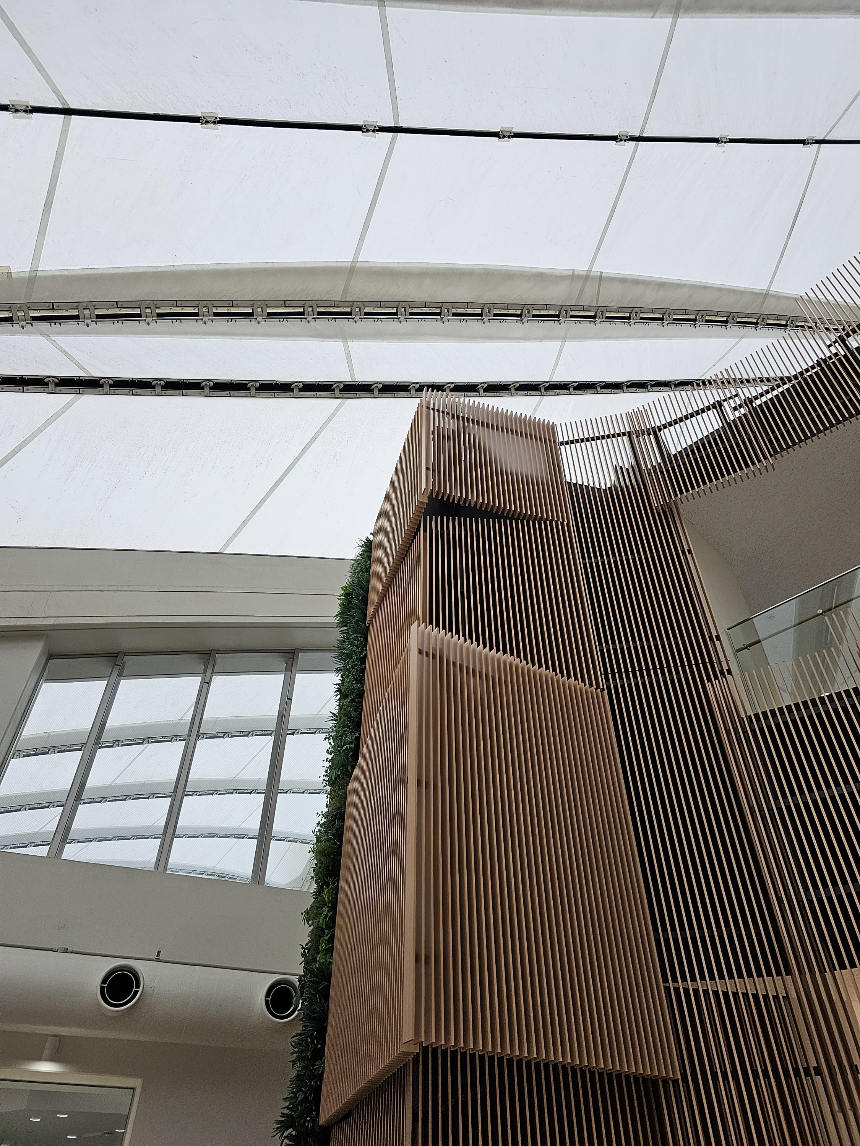 하지만 안쪽은 칼라가 화사합니다. 막구조와 유리 지붕이 조명을 설치하지 않아도 분위기를 밝게 만듭니다.