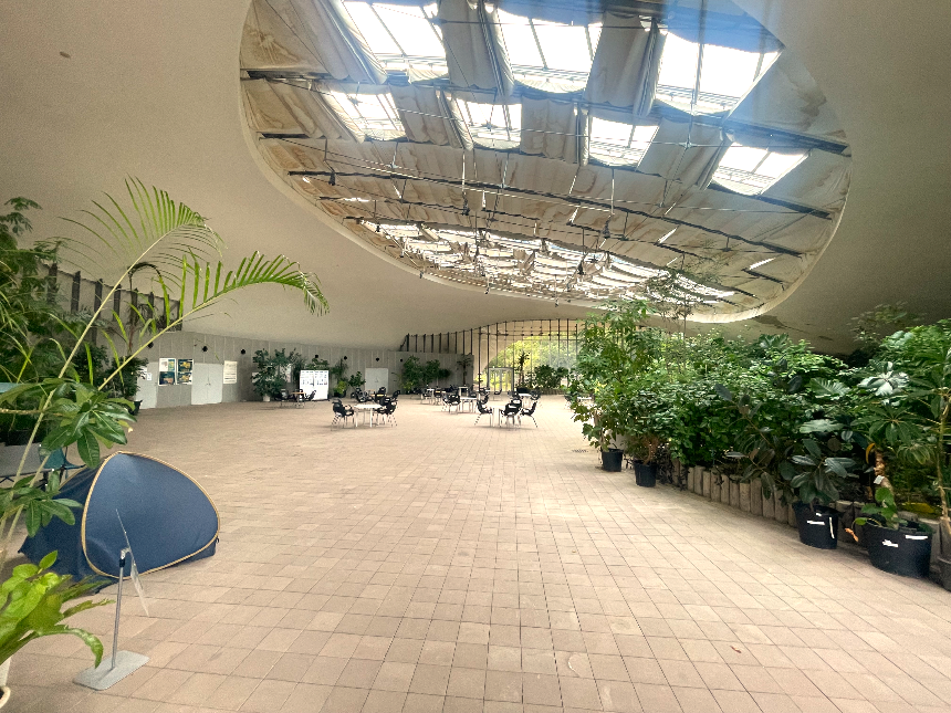 하지만 안쪽은 칼라가 화사합니다. 막구조와 유리 지붕이 조명을 설치하지 않아도 분위기를 밝게 만듭니다.