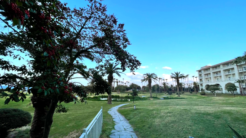숙소동인 웨스트타워의 2층을 통해 나오면 야외 정원이 넓고, 아름답게 펼쳐집니다.