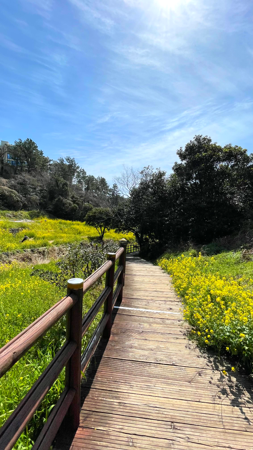 노랗다 못해 눈부신 샛노란 빛의 유채꽃길을 따라 걷다 보면, 미라지 연못이 나오며 좌측으로 올라가면 롯데호텔 산책로와 이어져 있습니다.