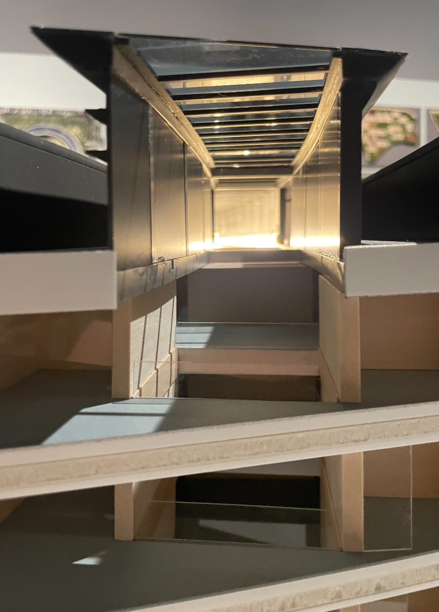 각 피라미드의 정점에 위치한 지붕 조명을 통해 자연광이 실내로 유입됩니다.