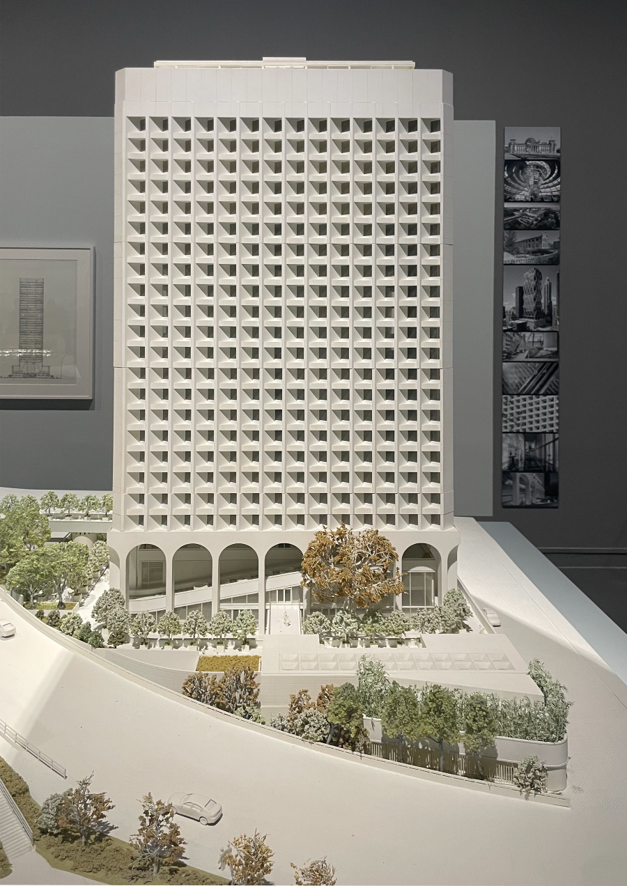 건물의 조각적 형태는 땅 아래에 솟아나는 일련의 상호 연결된 피라미드가 있는 지형으로 인식되며, 갤러리 공간은 지하로 가라앉고 조경화된 광장으로 둘러 쌓여 있습니다.