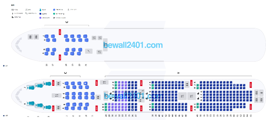 좌석간격 : 프레스티지석 50inch (127cm) 일반석 30~31inch (76~79cm)