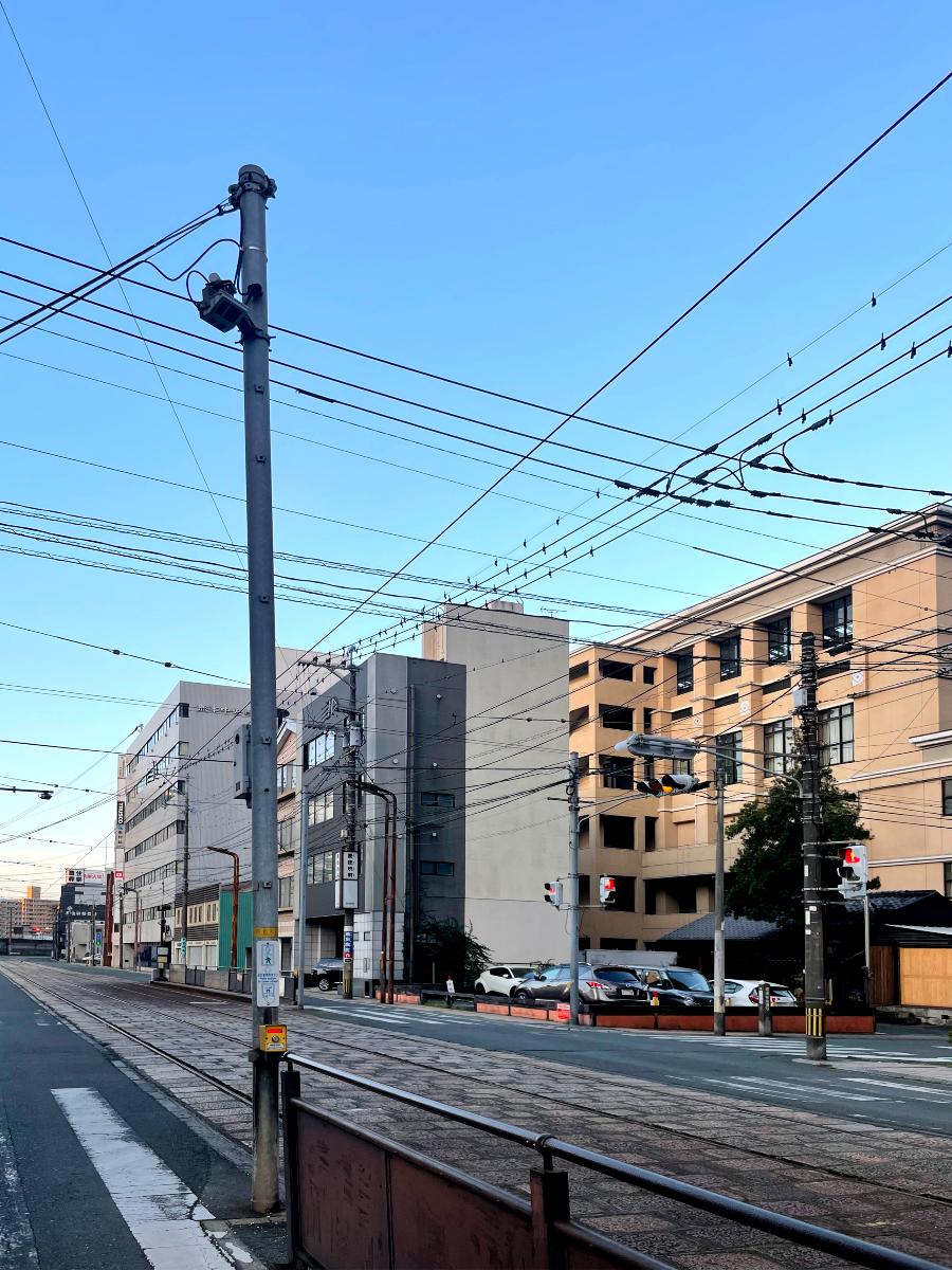 새벽의 구마모토 시내는 조용하고, 구름 없이 깨끗한 날씨입니다.