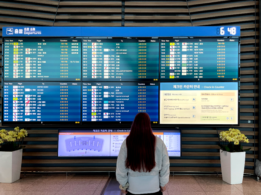 [공항도착 후] 인천공항내 3층 출발층에 있는 운항정보 안내 모니터(FIDS)에서 체크인카운터 확인