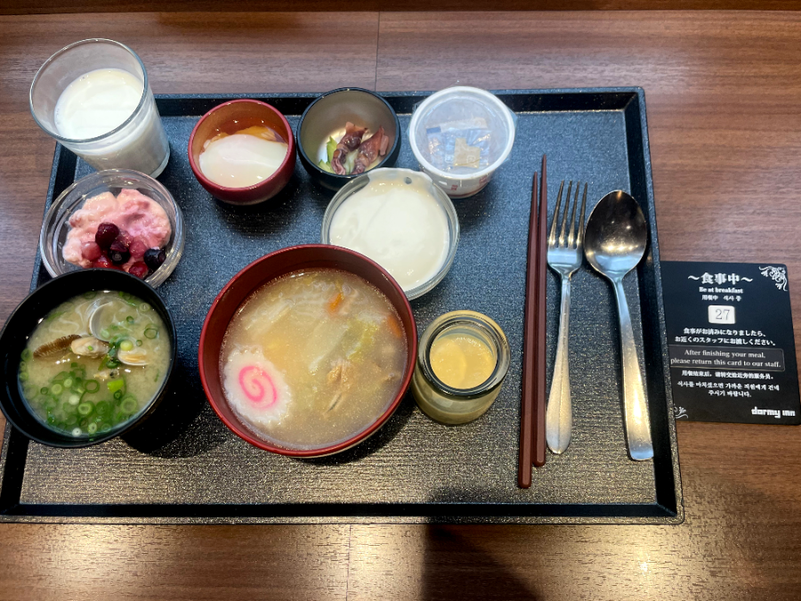 아침식사는, 전국의 도미인 체인 공통의 일본과 서양 뷔페, 코하치 요코쵸과 갓 만든 계란 요리에 더해, 지역마다의 특색을 낸 「당지 일품요리」를 제공하고 있어서 가격도 저렴하지만 식사의 퀄리티는 괜찮습니다.
