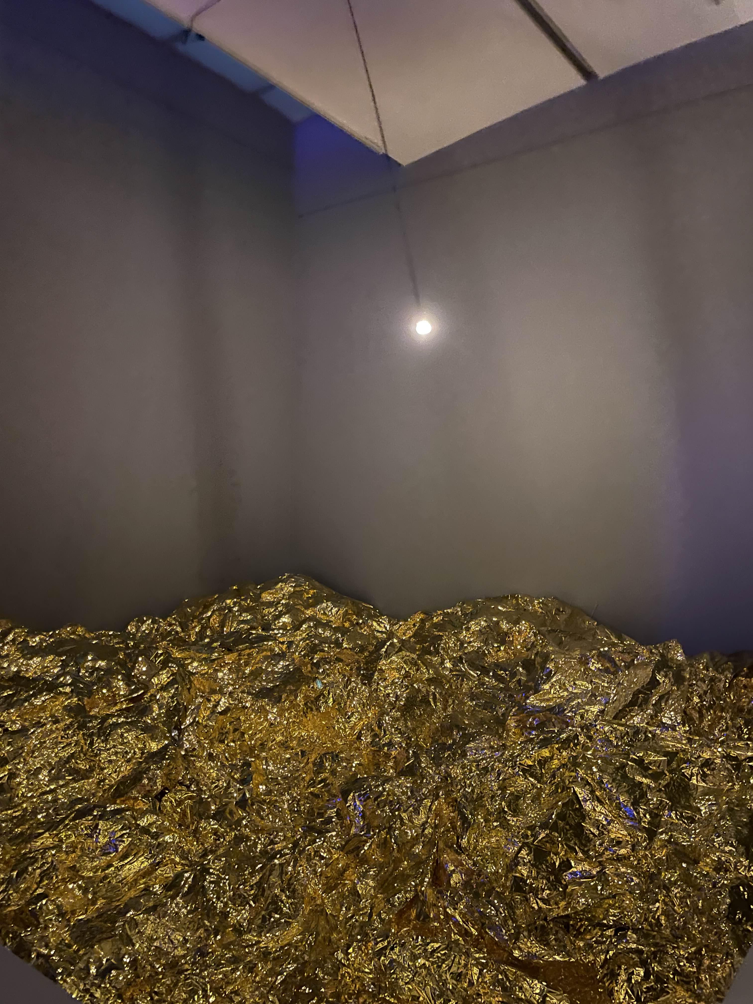 금빛 오브제와 빛 모빌리티를 활용하여 모든 게 시선에 따라 달리 보이는 듯함을 느끼게 해 준다.