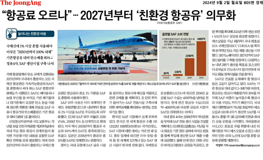 앞서 설명드렸다시피 국제 항공업계의 탄소 규제가 강화되는 2027년부터 국내에서 출발하는 모든 국제선 항공편은 항공유의 최소 1%가량을 지속가능항공유(SAF)를 혼합해서 써야 하는 SAF 혼합의무화 제도가 시행돼서 우리나라도 바쁘게 돌아가고 있습니다.