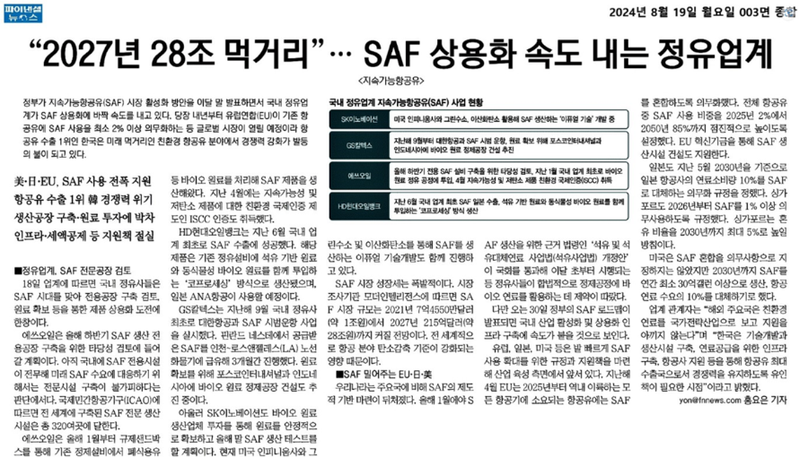 에쓰 오일은 지난 4월부터 국내 최초로 SFA국제인증 (ISCC CORSIA)을 획득해 본격적인 탄소 저감제품 생산을 시작했고, SK 이노베이션은 2027년까지 SAF 생산설비를 구축할 방침이며 GS칼텍스는 내년 2분기 생산을 목표로, 포스코 인터내셔널과 인도네이사 칼리만탄에 바이오 원료 정제시설을 건설 중이니 그나마 다행입니다.