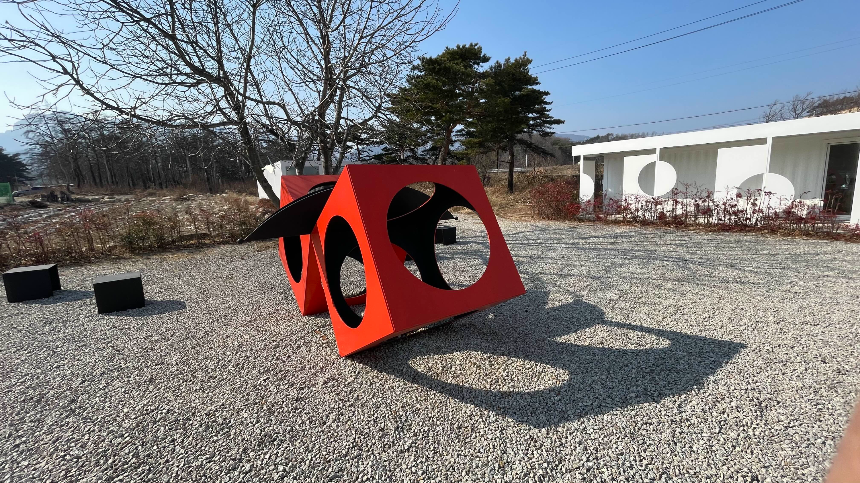 기존에 존치된 조형물들이 콘크리트로 박스형 구조물이 있는 반면 이쪽에 있는 건 금속패널로 만든 큐브를 라운드형으로 구멍이 뚫어 놨네요.