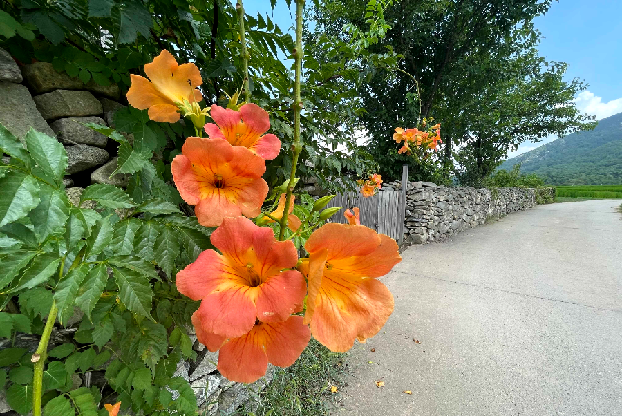 호박꽃처럼 생긴 능소화가 가옥 담장 사이로 삐져나와 담백한 공간에 홍일점 같은 역할을 합니다.