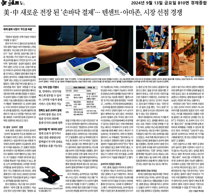 미국의 아마존과 중국 텐센트로 대표되는 미·중 의 새로운 전장이 된 '손바닥 결제'는 거대한 인구와 시장을 바탕으로 서비스가 확산 추세에 있습니다.