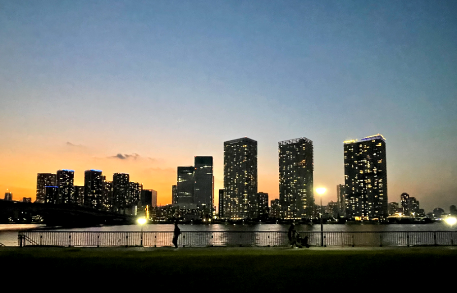 멀리 빌딩과 그 앞을 가로지르는 스미다 강줄기 앞으로 산책하는 사람들이 보입니다.