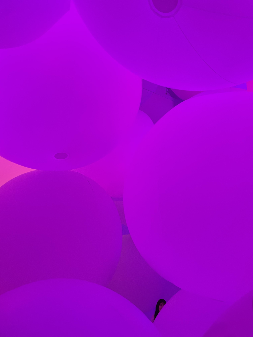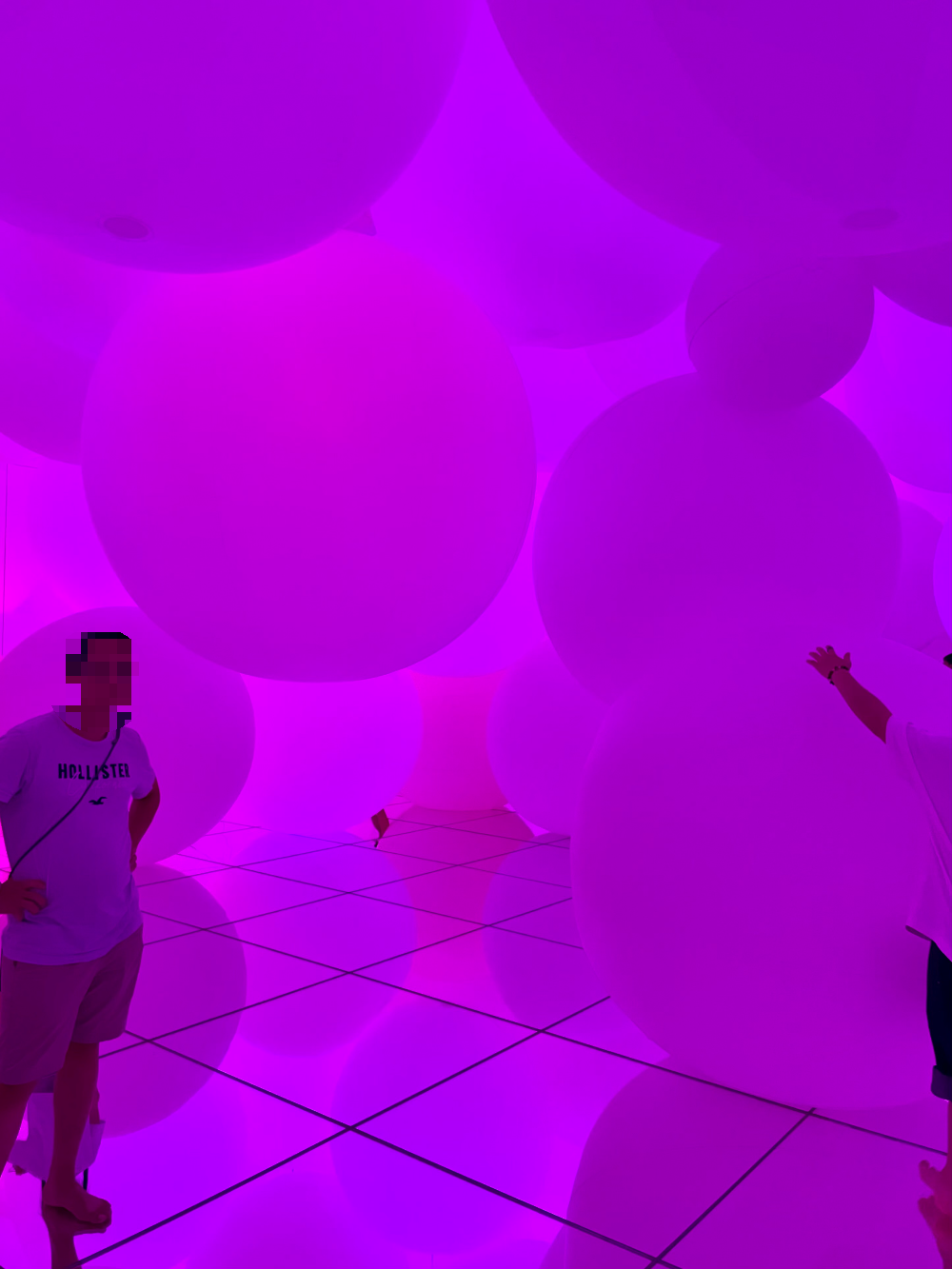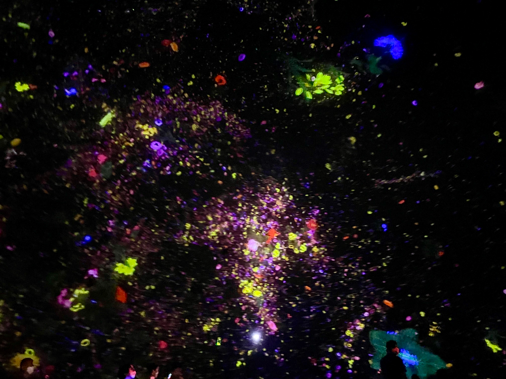 1일 차 늦은 저녁 팀랩 플래닛 속으로 들어가 '언덕 위의 빛의 폭포, 소프트 블랙홀, 사람과 함께 춤추는 잉어가 그리는 수많은 수면 위의 드로잉, 생명은 결정화된 덧없는 빛'을 감상하였는데, 그야말로 환상적인 미디어 아트였습니다.