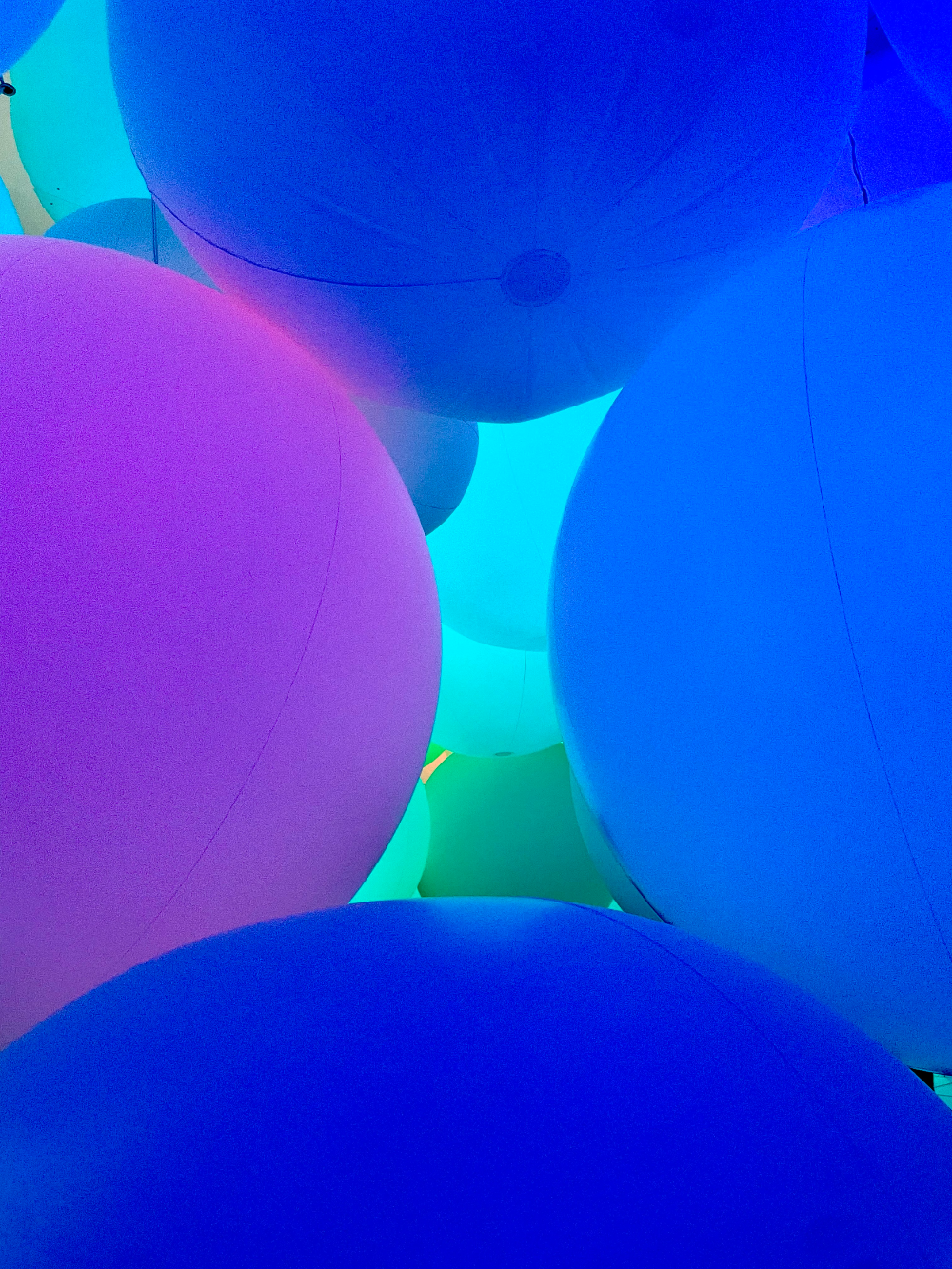 색이 변화하는 동안, 공간은 구체들의 집합에 의한 ‘입체’와 색의 ‘평면’ 사이를 오고 갑니다.