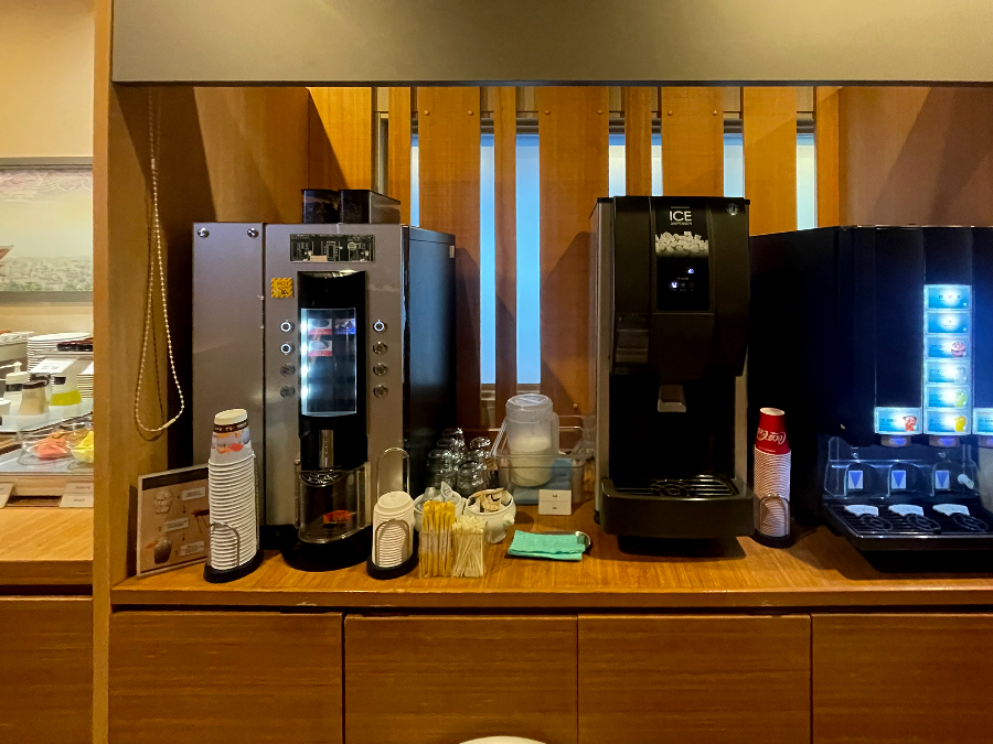 커피머신, 음료수, 우유, 아이스 메이커등이 보입니다.