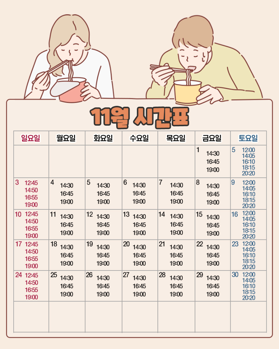 - 토요일 : 오후 12:00 / 14:05 / 16:10 / 18:15 / 20:20 (5회 공연)