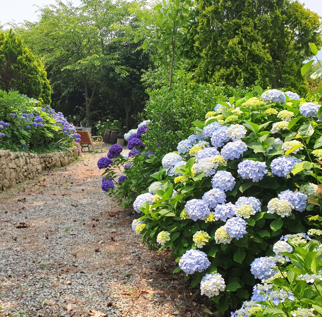 여름에는 하와이 같은 기후에서 선명하게 꽃을 피우는 수국 2,000여 주와 범부채꽃 군락들이 장관을 이루며, 긴 여름의 통영을 배려한 나무그늘아래 휴식공간도 조성되어 있습니다.