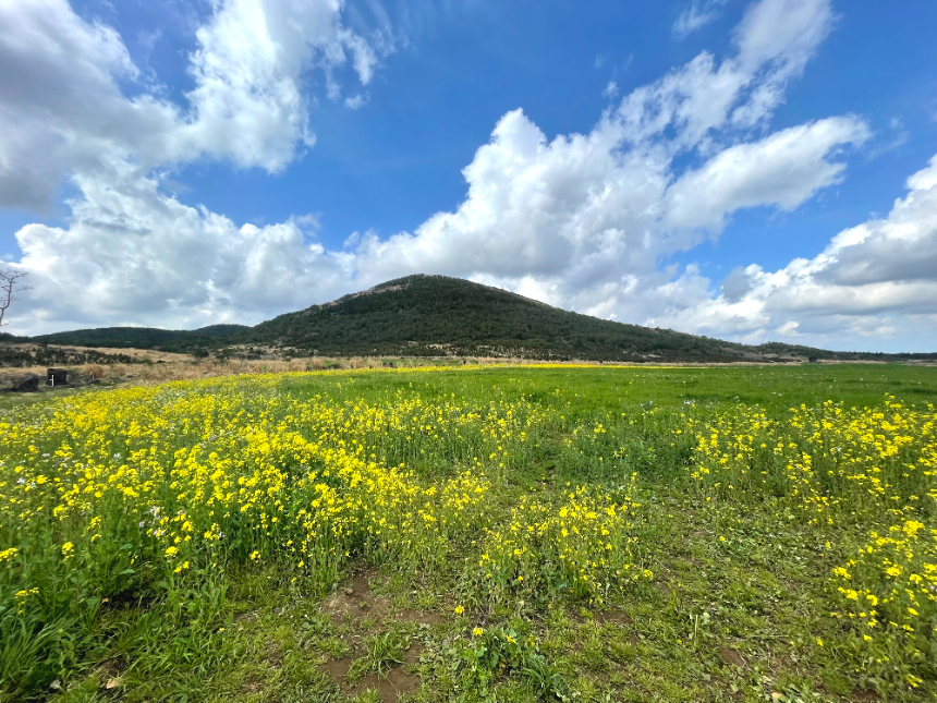 유채꽃들이 어디서든 조연을 마다하지 않고 주연배우 격인 '큰 사슴이 오름'과 그 주변을 멋지게 꽃빛으로 서포트하고 있습니다.