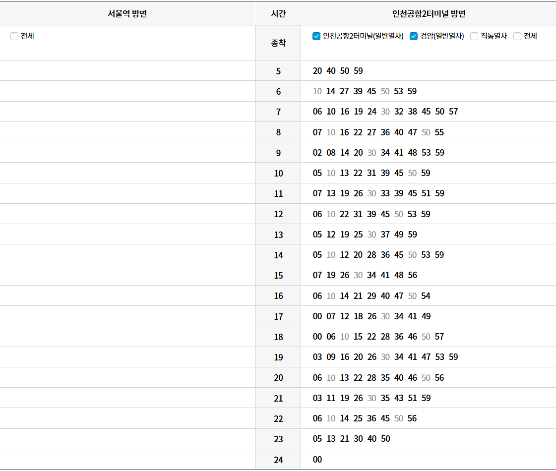 2) 공항철도 평일 시간표 (서울역 출발, 인천공항 제2 터미널)