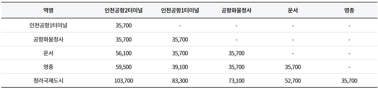| 청라국제도시 ~ 인천공항2터미널 (별도운임구간) |