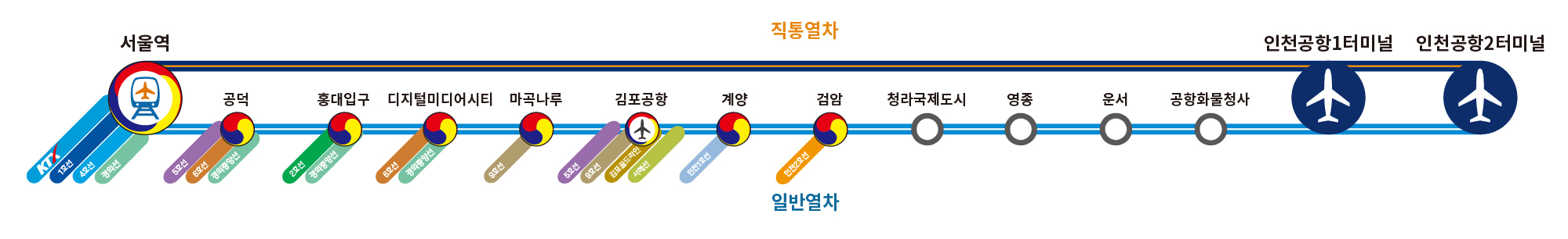 | 소요시간 | 서울역 ~ 인천공항1터미널역 : 59분 (일부 열차는 2~6분정도 추가소요) 서울역 ~ 인천공항2터미널역 : 66분 (일부 열차는 2~6분정도 추가소요) |