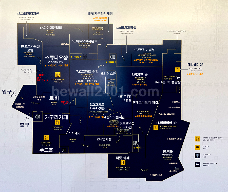 | 시설정보 | 해리포터 테마파크 - 해리포터 영화세트, 소품, 생물, 특수활영, 의상, 디자인, 레스토랑, 카페, 스튜디어 투어숍, 상점 |