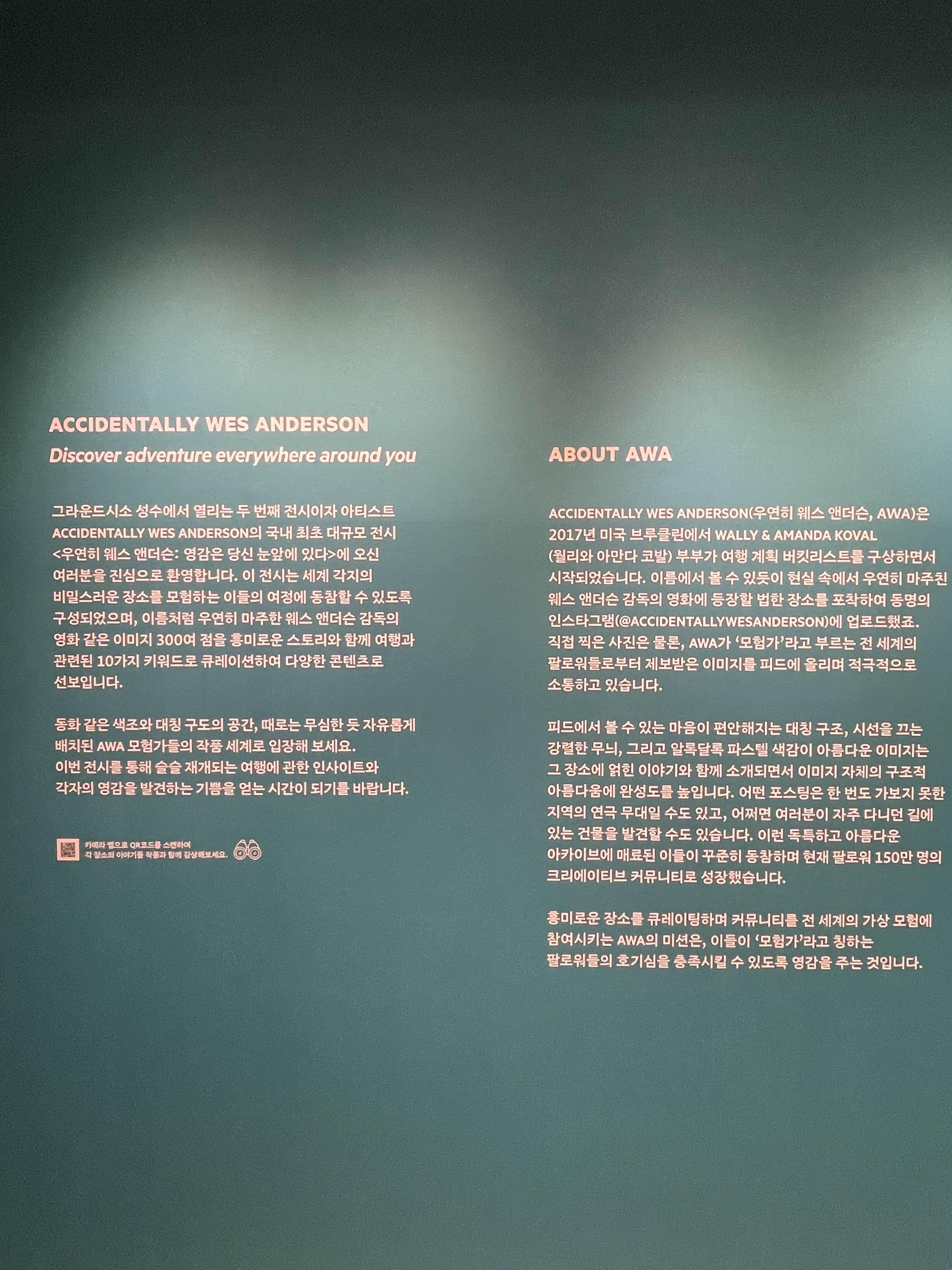이 전시는 '우연히 웨스 앤더슨'이라는 사진 커뮤니티에서 수집된 전 세계 사람들이 찍은 300여 점의 웨스 앤더슨 풍의 사진들을 전시하며, 웨스 앤더슨의 향기를 마음껏 맡을 수 있다.