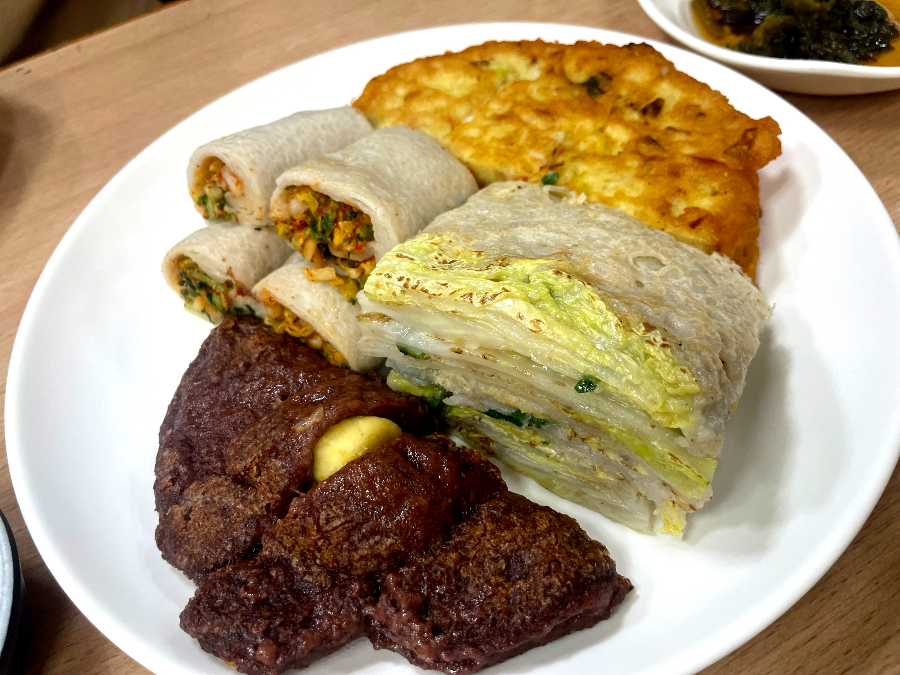 수수부꾸미와 녹두전도 단품으로 시켜도 좋지만 모둠전으로 시키면 이렇게 배추천등과 같이 나와 즐겁게 먹을 수 있어요.