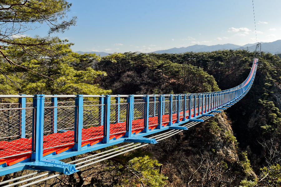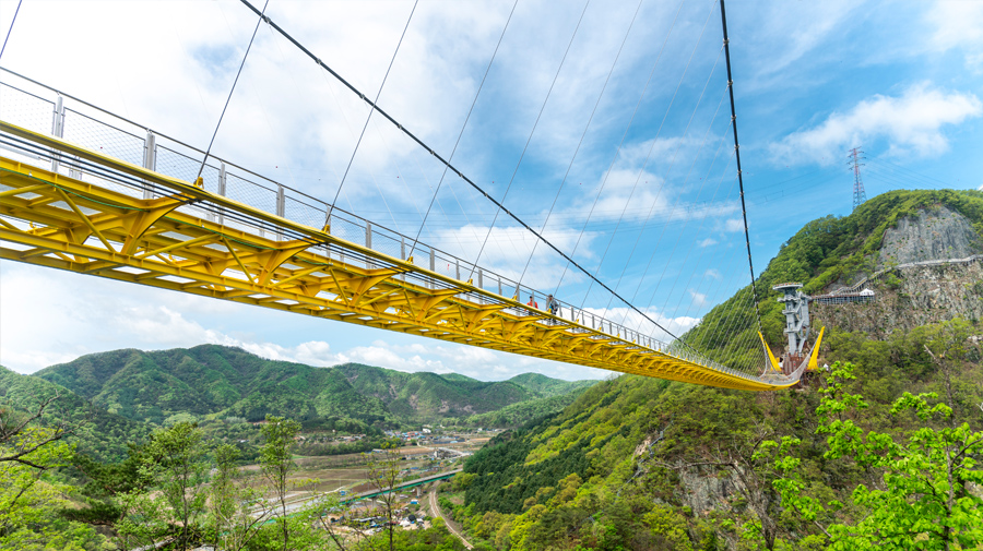 2018년 개장 이래 400만 명이 방문하는 등 원주를 대표하는 관광시설로 자리매김한 높이 100m, 길이 200m의 산학보행교로 한 발짝 디딜 때마다 출렁이는 아찔함과 거칠게 솟은 기암괴석의 절경은 환상적인 경험을 선사합니다.