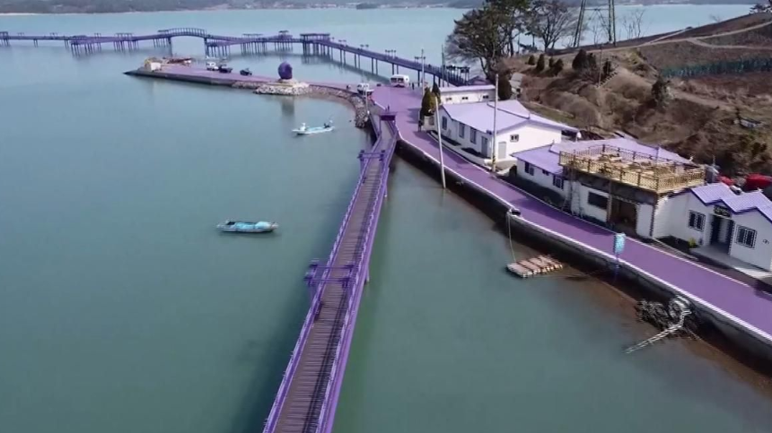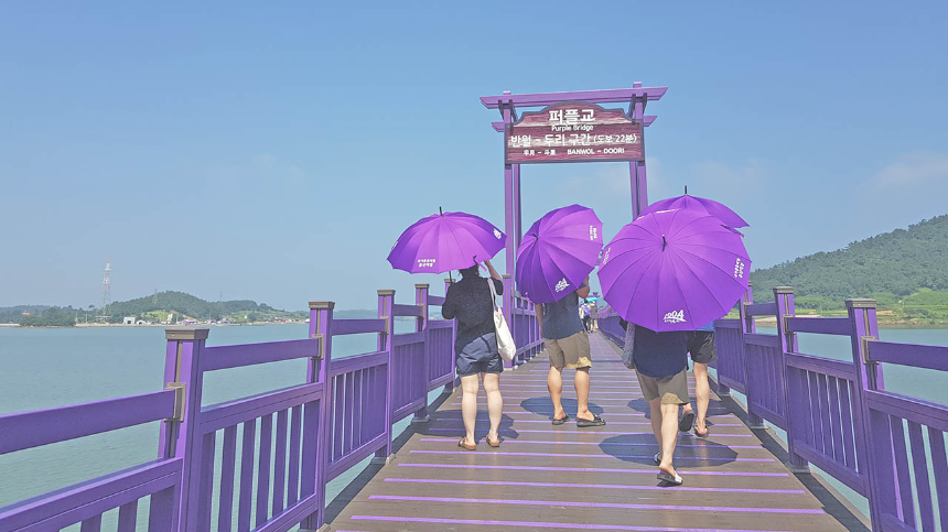 반월도와 박지도를 연결하는 보라색 목조다리로, 바다 위를 걷는 듯한 기분을 느낄 수 있어요.
