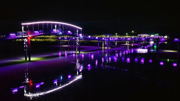 📸 포토존: 다리 위에서 보랏빛 조명을 배경으로 실루엣 사진 찍기!